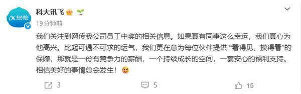 针对这一传闻,科大讯飞很快在官方平台上作出回应。公司表示,已经注意到了网上关于员工中奖的相关信息,并表示如果真有同事如此幸运,公司会由衷地为他感到高兴。