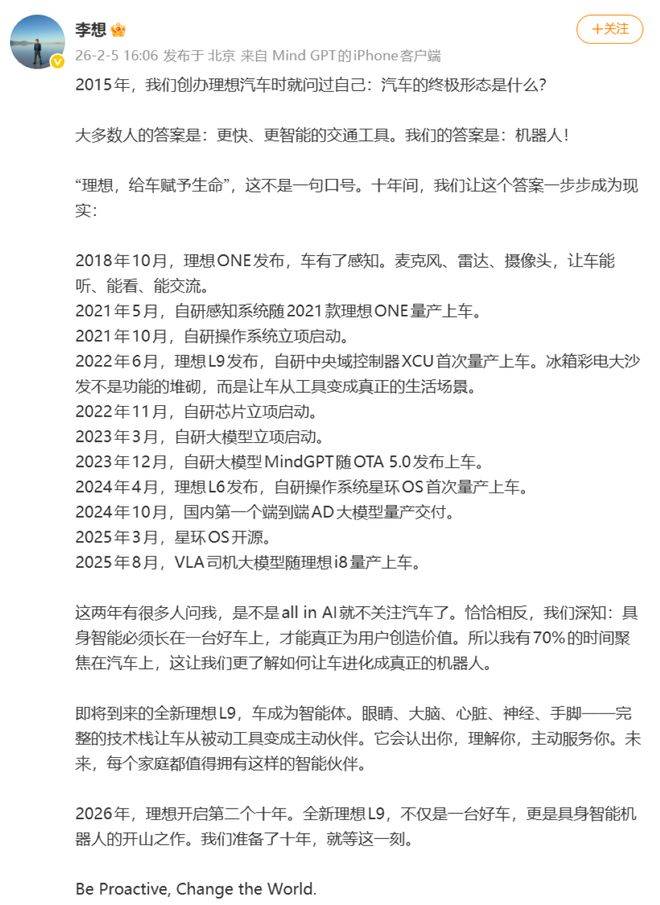 技术路线图显示,理想正在将汽车与机器人技术深度融合。全新理想L9的宣传资料透露,该车型将搭载2颗5nm制程的自研马赫100芯片,具备2560TOPS算力,其智能悬架系统可实现毫秒级高度调节。李想在社交媒体预热时特别强调:"2026年开启新十年,L9不仅是汽车,更是具身智能机器人的开山之作。"这印证了公司正通过硬件本体团队加速机器人技术落地。